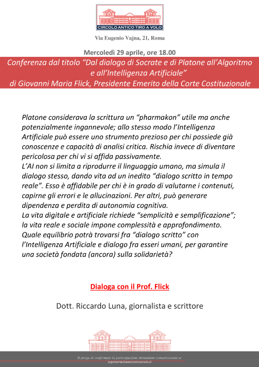 “Conferenza al Circolo del Prof. Giovanni Maria Flick dal titolo: “Dal dialogo di Socrate e di Platone all’Algoritmo e all’Intelligenza Artificiale